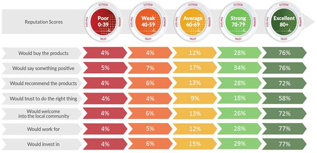 Reputation Institute’s research reveals that reputation drives business results. The better the reputation, the more support a company gets. For companies with an Average reputation, only 12% would definitely buy the products; this climbs to 28% if the reputation is Strong, but increases to 76% if the reputation is Excellent. At present, only four companies sit in this category.