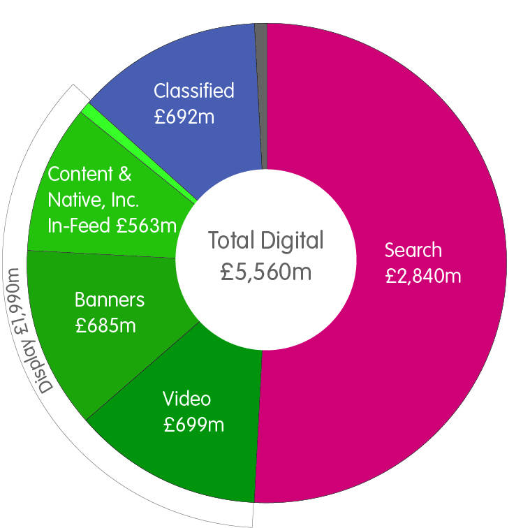 Display advertising as a whole grew 18% to £2 billion, whilst search grew 15% to £2.8 billion and classifieds remained flat at £692 million. Thus, overall digital ad spend grew 13.8% to £5.56bn in the first half of 2017.
