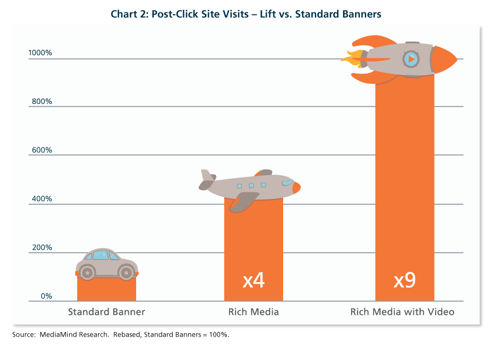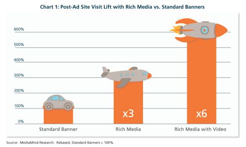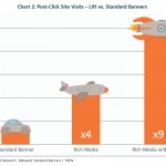 The results show that users who have last seen a rich media ad are about three times more likely to browse to the advertiser’s website versus those who have last seen a standard banner. Advertisers who added video to the banner boosted site visits six-fold versus standard banners. For direct response, results show that users are four times more likely to click and visit the advertiser site after watching rich media ads versus standard banners and are nine times more likely after viewing rich media with video.