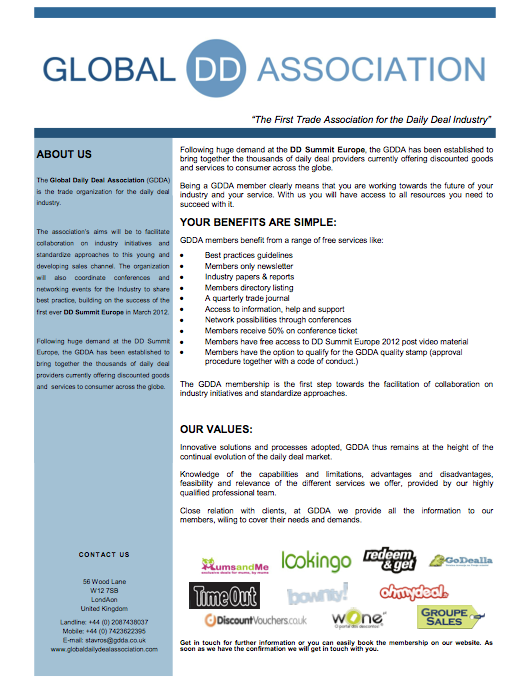 Set up following huge demand at the DD Summit Europe in March, the new trade body has been established to bring together daily deal providers from across the world to collaborate on industry initiatives and standardise approaches to this new and rapidly expanding sales channel.