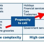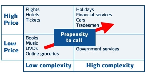 When someone makes a purchase, they go through a number of different decision making processes. Whether they need more human interaction to help them with their decision to buy will depend on the complexity and price of the product. Thus a regular purchase of a commodity type product (eg music or books) requires no human interaction and is easy to click and buy. However, when buying a car which is bought infrequently then a customer will want to talk to a salesman about the features, benefits and price. Depending on the product type, it is possible to create a simple 2 x 2 matrix that allows companies to work out whether they should be adding layers of phone based customer service into their internet mix as a way of differentiating their offering. This matrix looks as follows:-