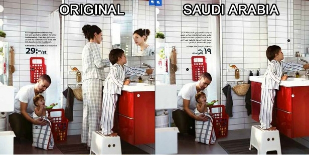 IKEA made women disappear from its furniture catalog in Saudi Arabia. Looking at the Swedish and the Saudi versions of the catalog, the Swedish free newspaper Metro noticed that IKEA photoshopped women out of identical pictures showcasing its furniture.More