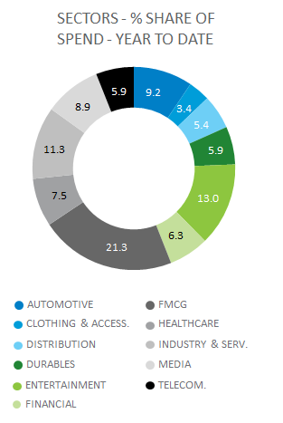 The industry and services macro sector was also worthy of an honourable mention for the period with growth of 7.2 percent. This macro sector, which includes the business services, property, institutions, and power and water categories, maintains an 11.3 percent share of ad spend.