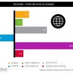 North America’s ad market waned slightly (1.3%) during the third quarter but still ended the first three quarters with a gain of 1.7 percent YOY. The small decline in the region’s third quarter ad market partly reflects this year’s decrease in political advertising, which ruled the airwaves in advance of the U.S. election last fall.