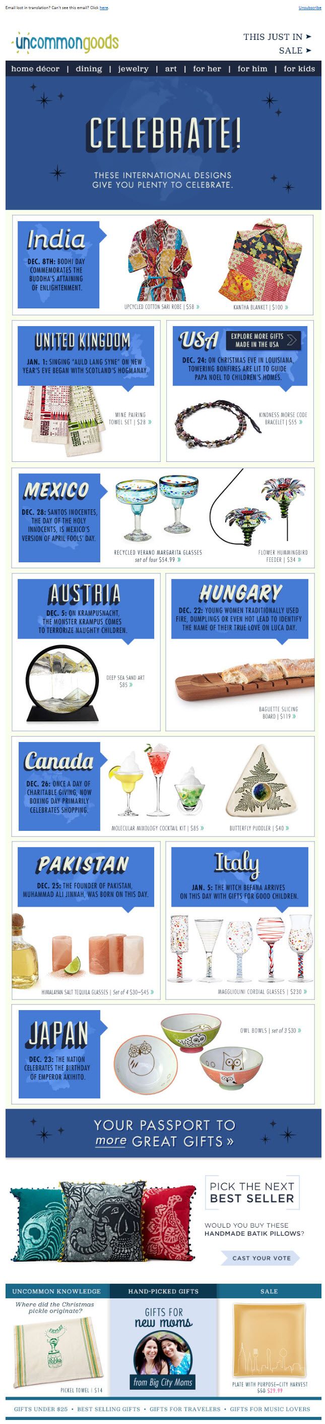 Uncommon Goods Purveyor of unusual products – Uncommon Goods engages subscribers not only with some interesting gift ideas, but with interesting tidbits about celebrations in other countries around this time. It’s a great partnering of products and content that speaks to both buyers and browsers. —Chad White, Principal of Marketing Research, ExactTarget