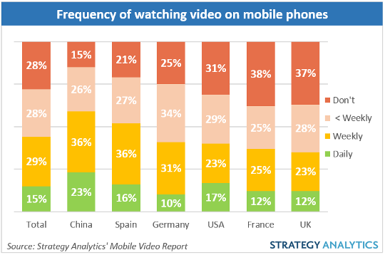 Mobile video consumption is almost three times more likely to be done via WiFi (68%) than via a mobile network (24%). The share of streaming over 3G/4G was highest in France (33%) and the USA (30%).