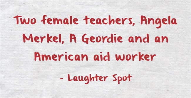 Laughter Spot : Two female teachers, Angela Merkel, A Geordie and an American aid worker