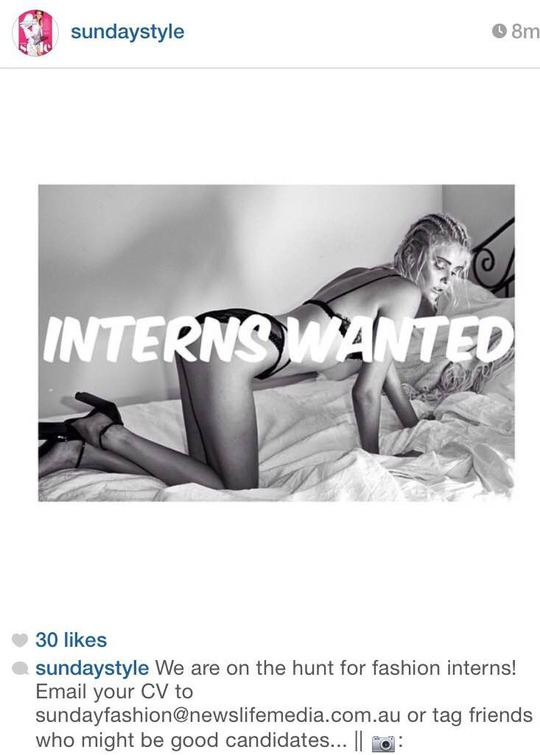 Yes, in what has to be categorized as the dumbest marketing move of the century, News Corp. Australia publication Sunday Style posted an image of a woman clad in heels and lingerie atop a bed on Instagram with the copy, “We are on the hunt for fashion interns! Email your CV to sundayfashion@newslifemedia.om.au or tag friends who might be good candidates”