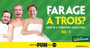 But here’s it’s election debut – for Irish bookie Paddy Power, the disruption specialists. Paddy is offering odds on various coalition permutations and @LuckyGenerals has started its campaign with a pretty unlikely one, Messrs Cameron, Farage and Clegg.