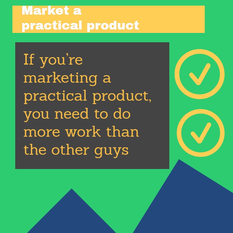 If you’re marketing a practical product, you need to do more work than the other guys. However, if your product isn’t fancy looking, that’s not to say it doesn’t have all the bells and whistles. Highlight the benefits and let the customer know exactly why they need to have your product. Spell it out for them, so they’ll understand quickly. If you’re not in the limelight, seek them out and tell them what’s in it for them.