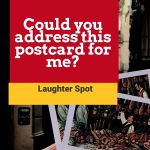 New Laughter Spot. A man writing at the post office desk was approached by an older fellow with a postcard in his hand.