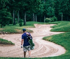 As he does so, two tees fall out of his shirt pocket onto the ground.
