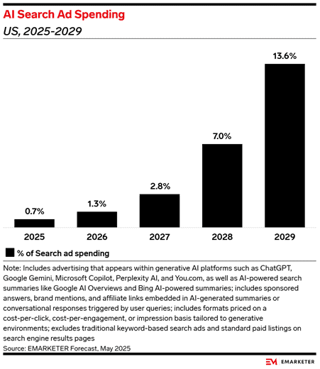 AI-powered search advertising is on the rise—and fast. What started as a niche experiment is quickly turning into a multi-billion dollar category. In 2025, AI search ads are expected to pull in just over $1 billion. By 2029, that number could hit nearly $26 billion, making up 13.6% of all search ad spending, compared to just 0.7% today.